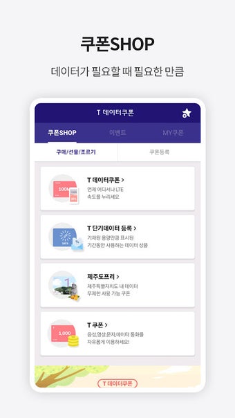T 데이터쿠폰 to produkt przedpłacony oferowany przez SKTelecom, który umożliwia użytkownikom dostęp do danych smartfonu na podstawie pojemności wskazanej na kuponie. Dzięki T 데이터쿠폰 użytkownicy mogą wygodnie korzystać z danych SKTelecomu bez konieczności osobnej subskrypcji lub konfiguracji.